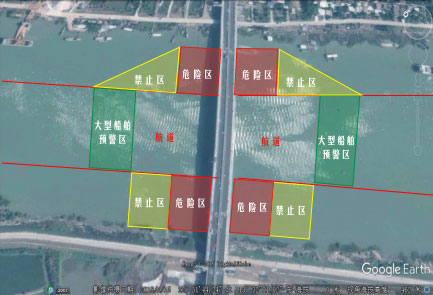 統(tǒng)可將航道上橋墩上下游一定距離的位置虛擬成AIS船,過往船舶靠近該區(qū)域時船載AIS會認為靠近了實體船舶而自動報警,提醒船舶駕駛員注意避讓系統(tǒng)通過接收船舶的AIS信號采集到進入橋區(qū)所有船舶的速度數(shù)據(jù),一旦發(fā)現(xiàn)船舶超過設(shè)定的安全速度,自動向船發(fā)出告警;系統(tǒng)能自動向駛?cè)霕騾^(qū)水域的船舶發(fā)布各種海事管制信息,橋梁施工、封航信息等