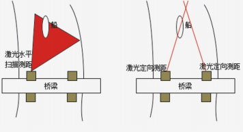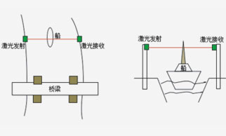將激光測距儀安裝在橋梁凈空高度上,水平對準航道持續(xù)測距,若出現(xiàn)近距離的物體,則判斷有超高船只。分為激光掃描式和激光交叉測距式兩種類型。
